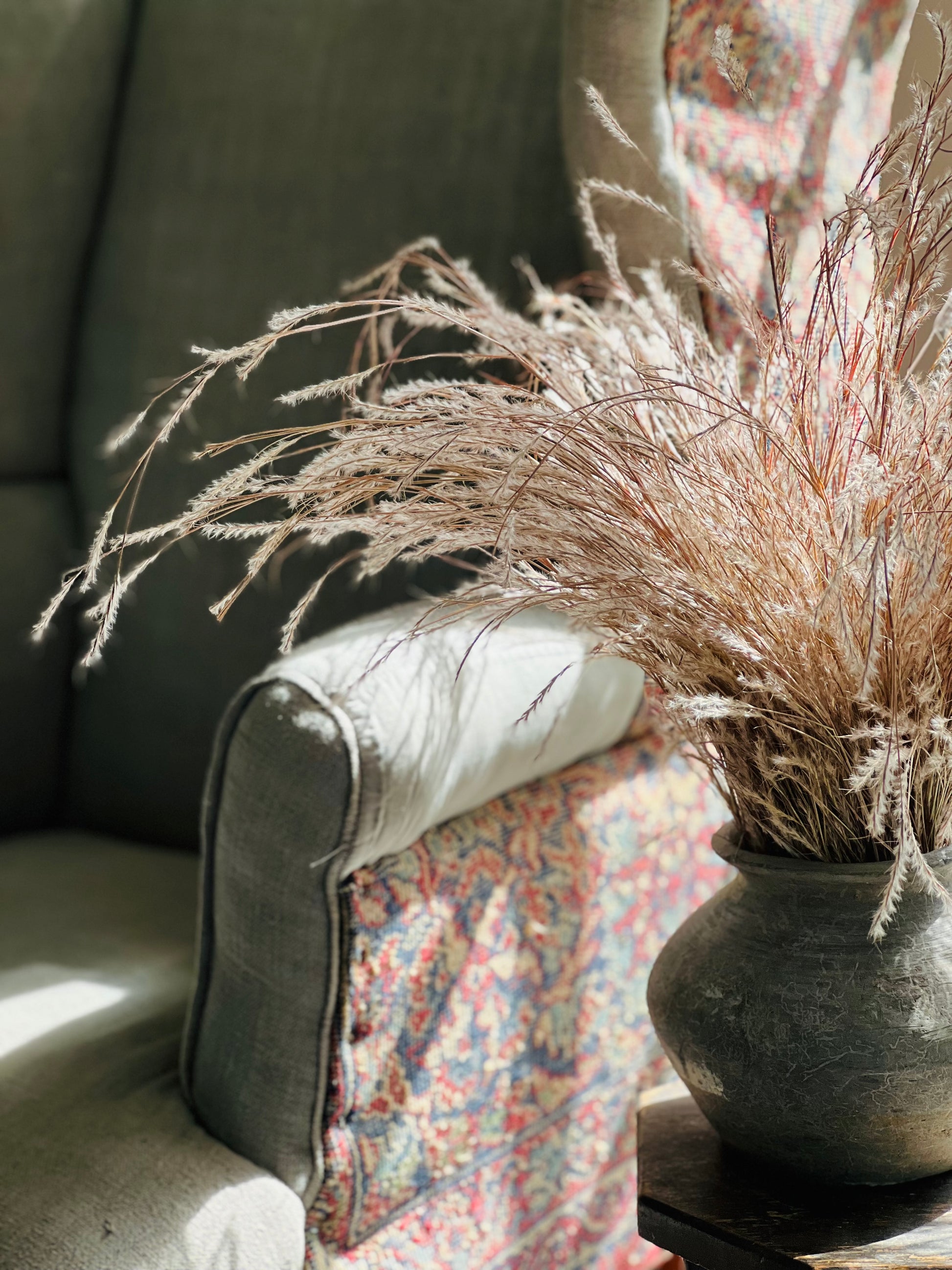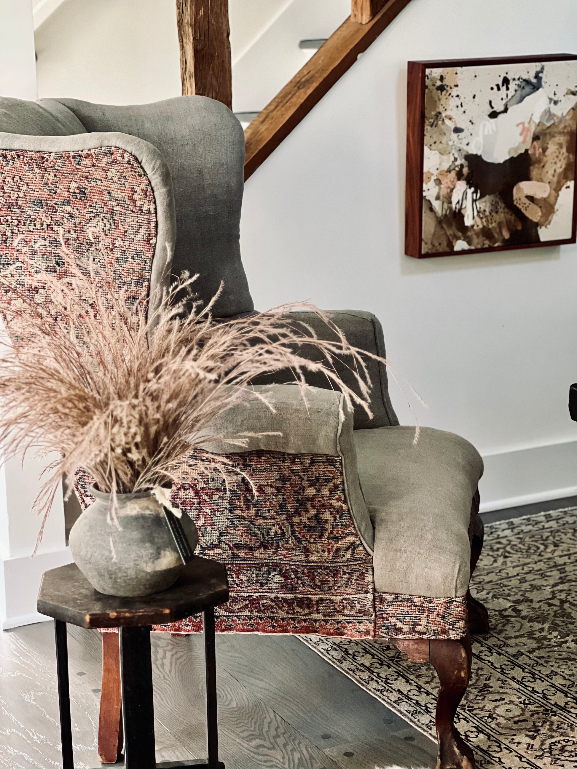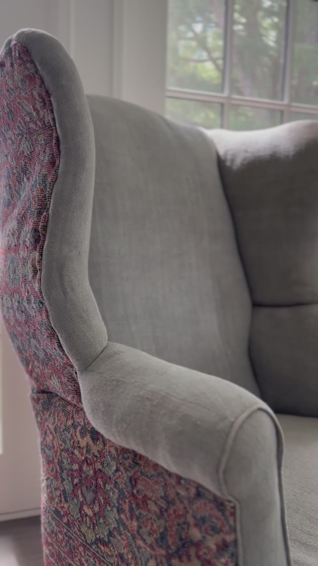 The details that make this antique, clawfoot, wingback chair special are numerous. The chair was reupholstered using a patchwork of the softest antique European hemp linen in the most subtle and earthy grey. It was beautifully paired with an antique Persian rug with a lovely, all over, floral motif in faded scarlet, aegean and indigo hues. This chair is amazingly comfortable and incredibly heavy and stable. It is a statement piece to build a room around.