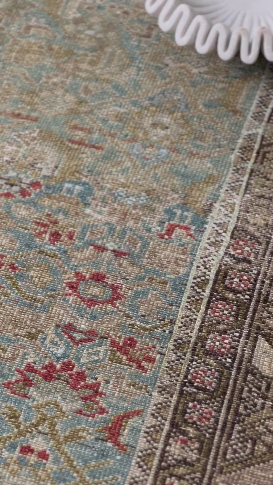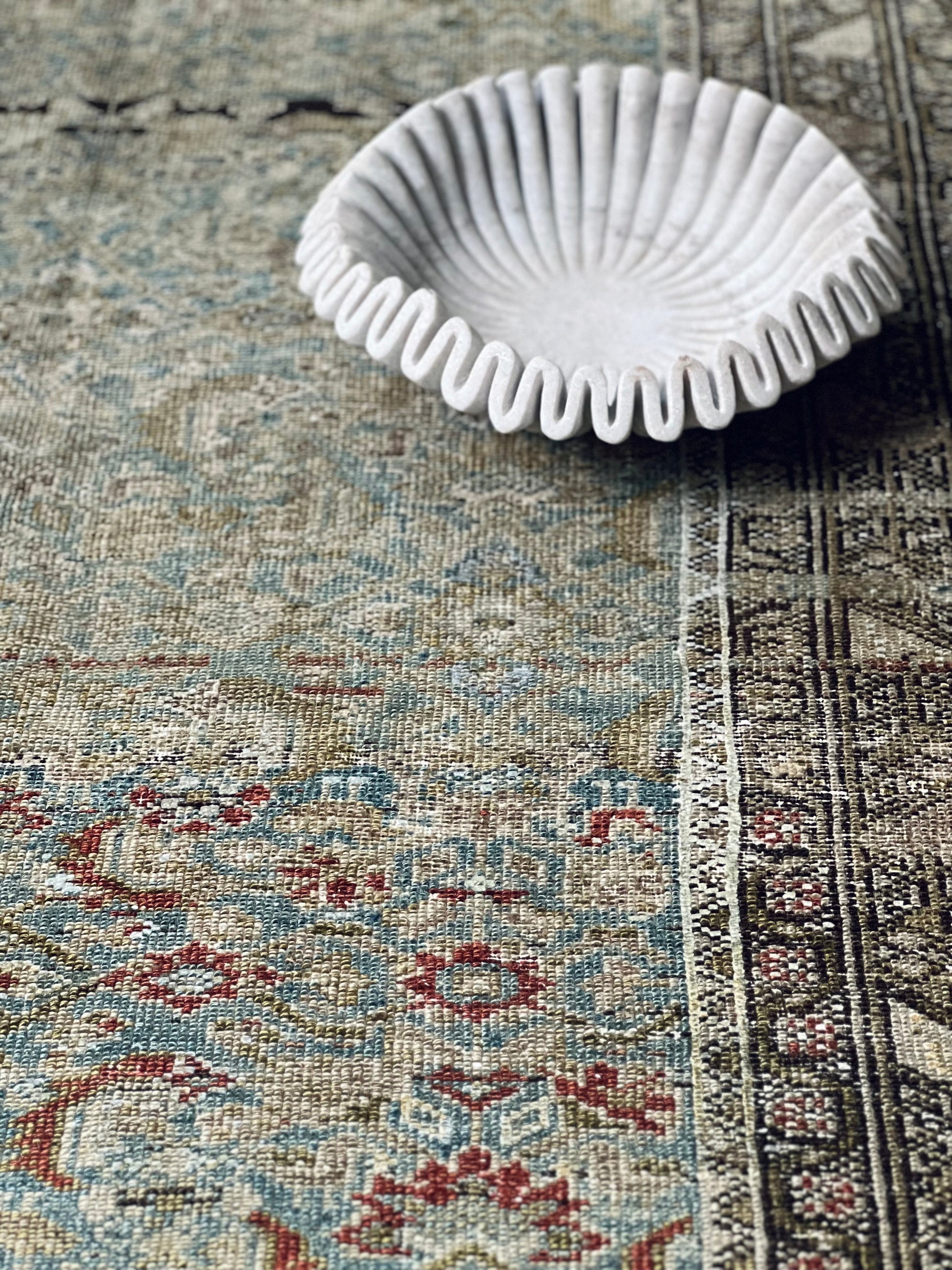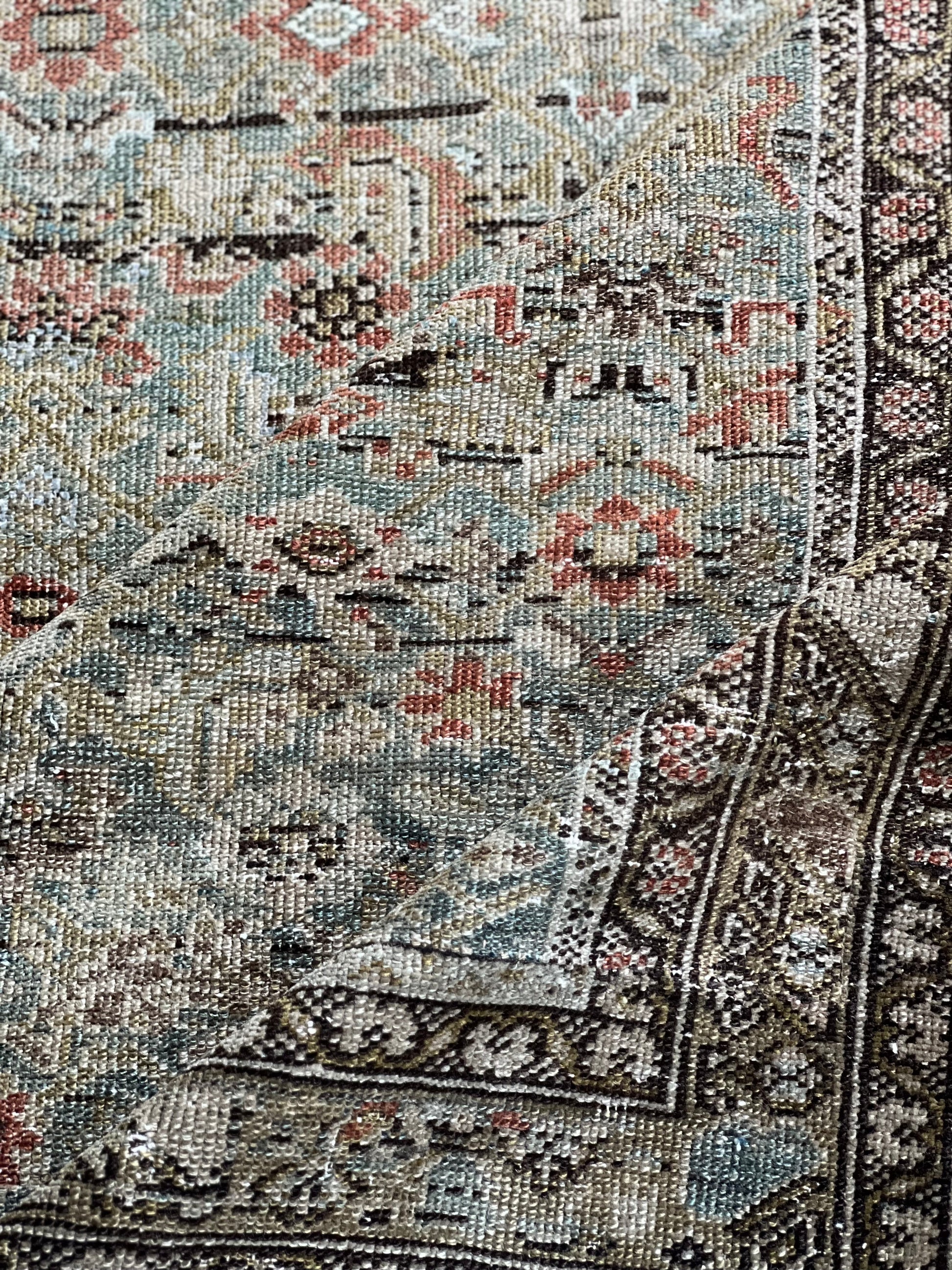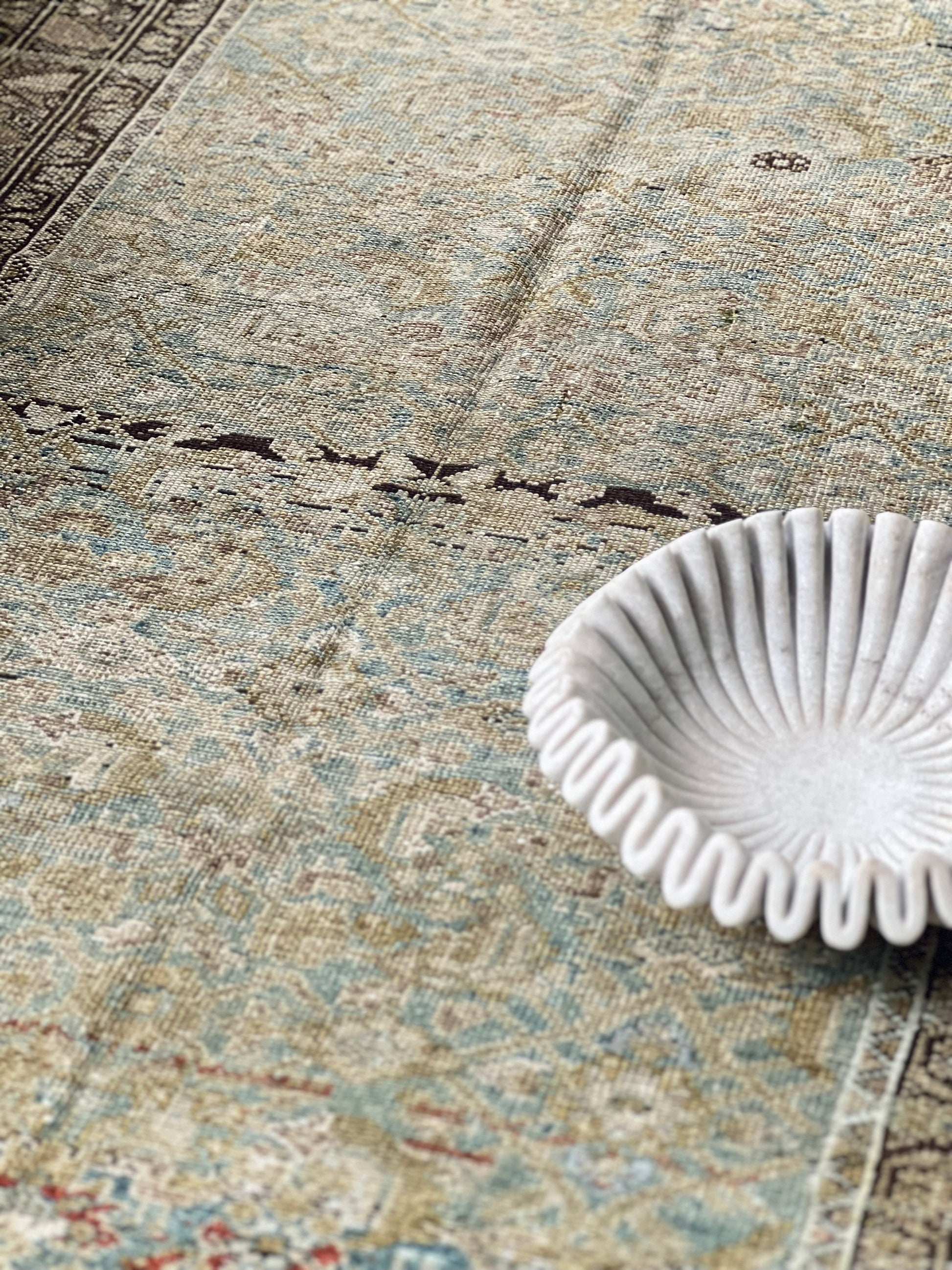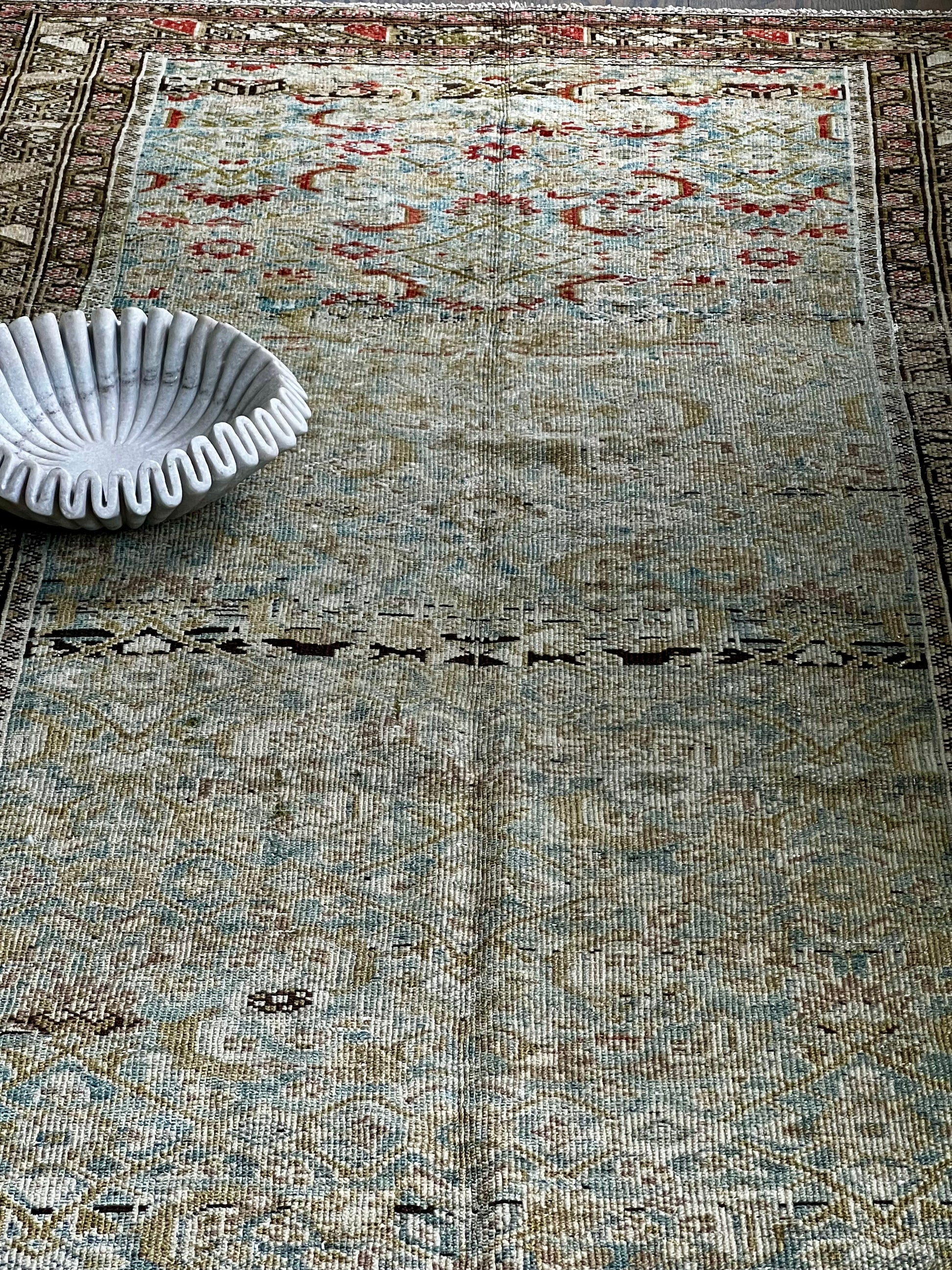 We love that antique rugs are meant for use- they make great hallway and kitchen pieces and can stand up to even the heaviest foot traffic or spill. This antique beauty was woven in the villages of the Malayer region in the early 1900s and was likely created by a family or several families working together. Note that some areas of the rug have the beautiful scarlet dyes woven into the floral motifs on the field and other areas omit it and are entirely olive and blue. This variation and the artistry of various weavers, is exactly why these rugs are so highly sought after and prized.