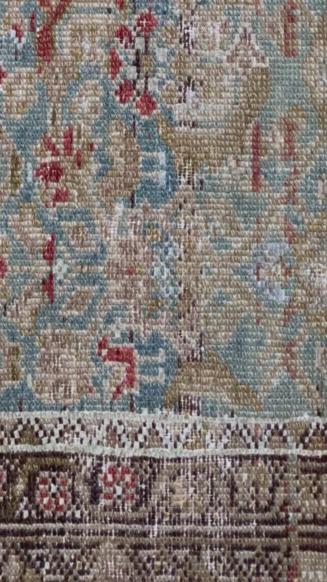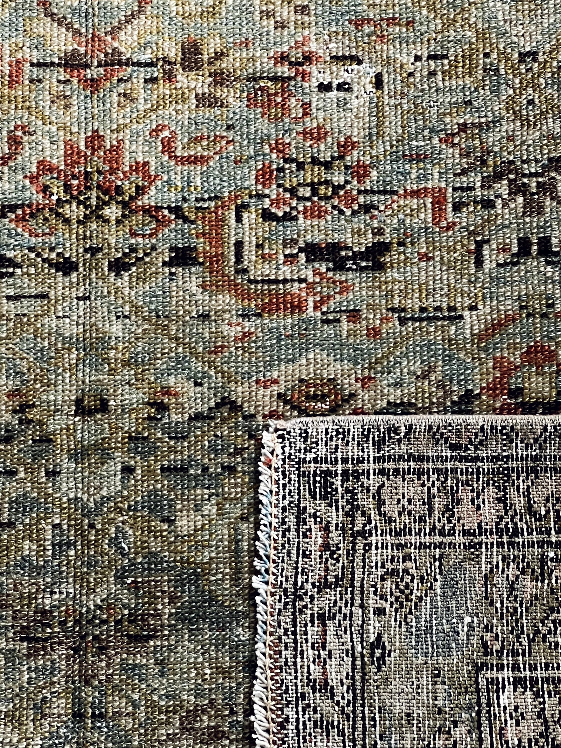 The field celebrates highlights of olive, cerulean, scarlet and sand with a rich border that incorporates a deeper chocolate. The compilation of months of work and thousands of individually hand tied knots come together to create this incredible work of art.