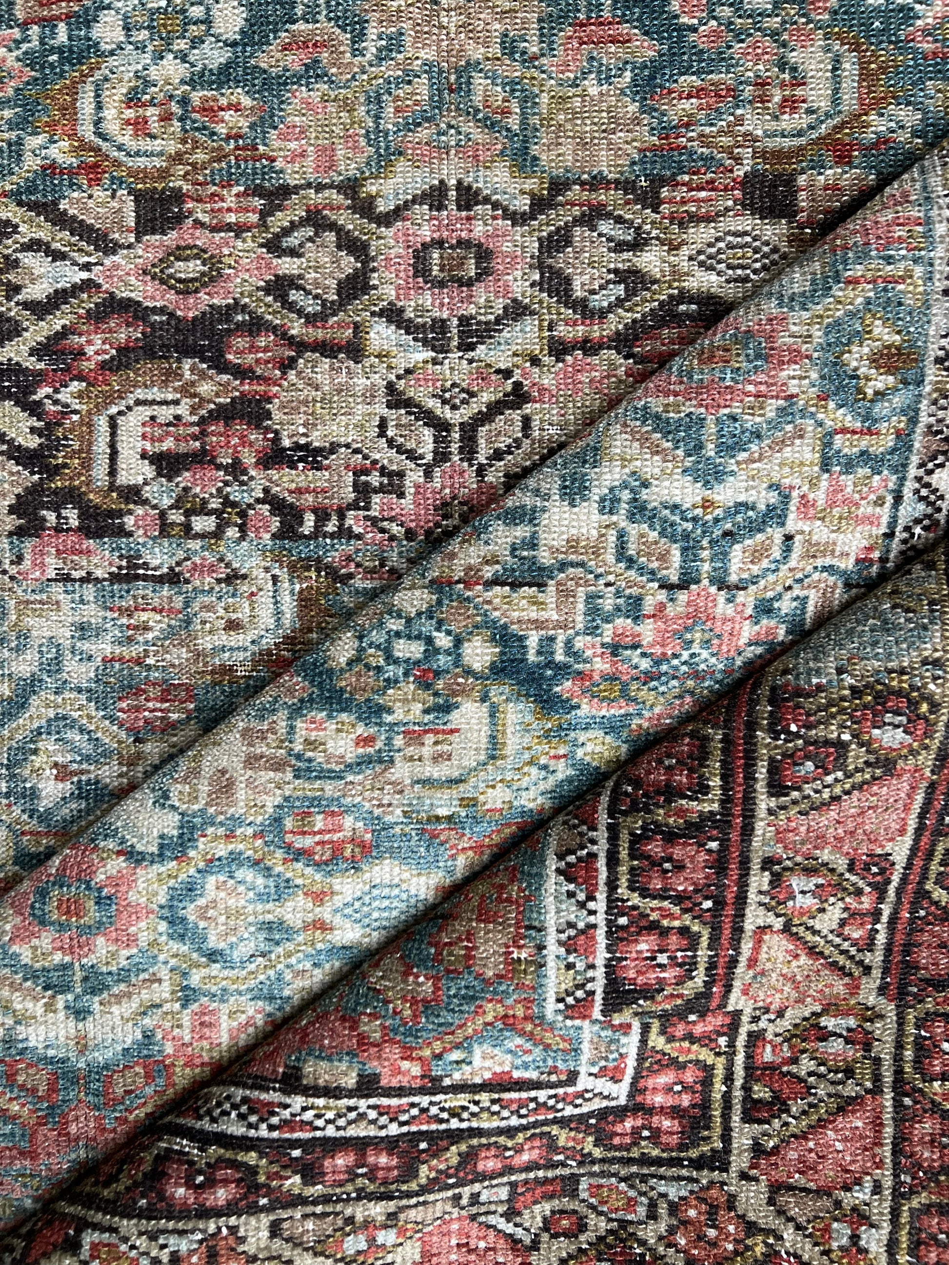 Woven by hand with vegetable dyes circa the early 1900s, this rug is a true gem. The field celebrates highlights of midnight blue, deep navy, cerulean, dusty rose and scarlet . The compilation of months of work and thousands of individually hand tied knots come together to create this incredible work of art. The variation throughout the weaving of this beauty highlights the artistry that comes from a team of weavers all having taken turns creating the rug.