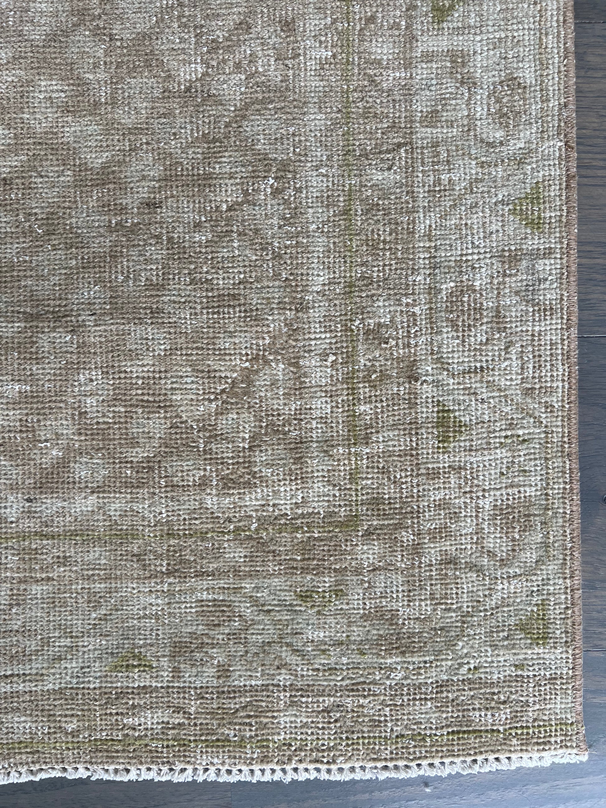 Woven by hand with vegetable dyes in the early 1900s, this rug is a beauty. The field celebrates highlights of cream, sand and toffee with hints of dusty rose, sky blue and leaf green. The compilation of months of work and thousands of individually hand tied knots come together to create this incredible work of art.