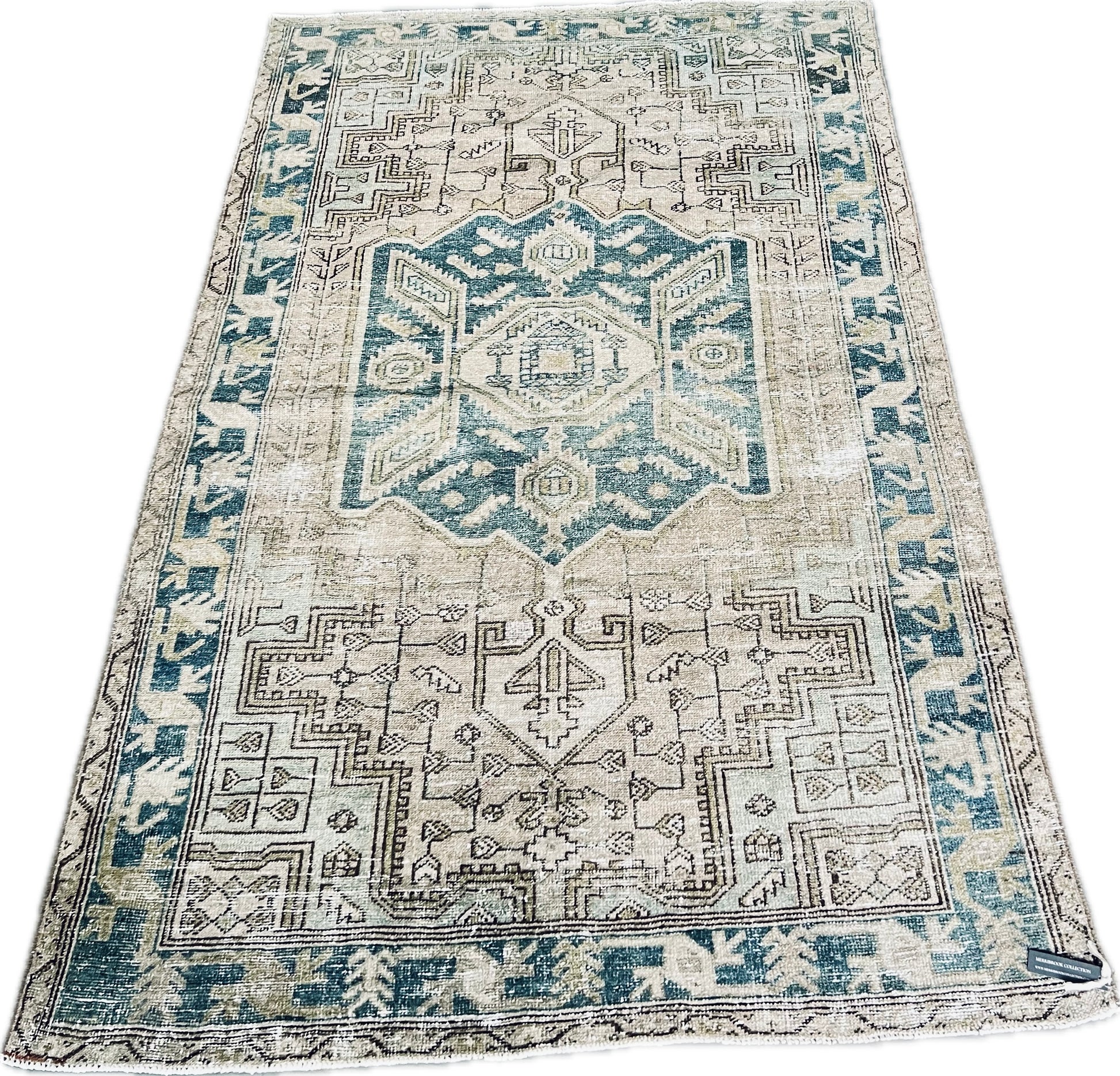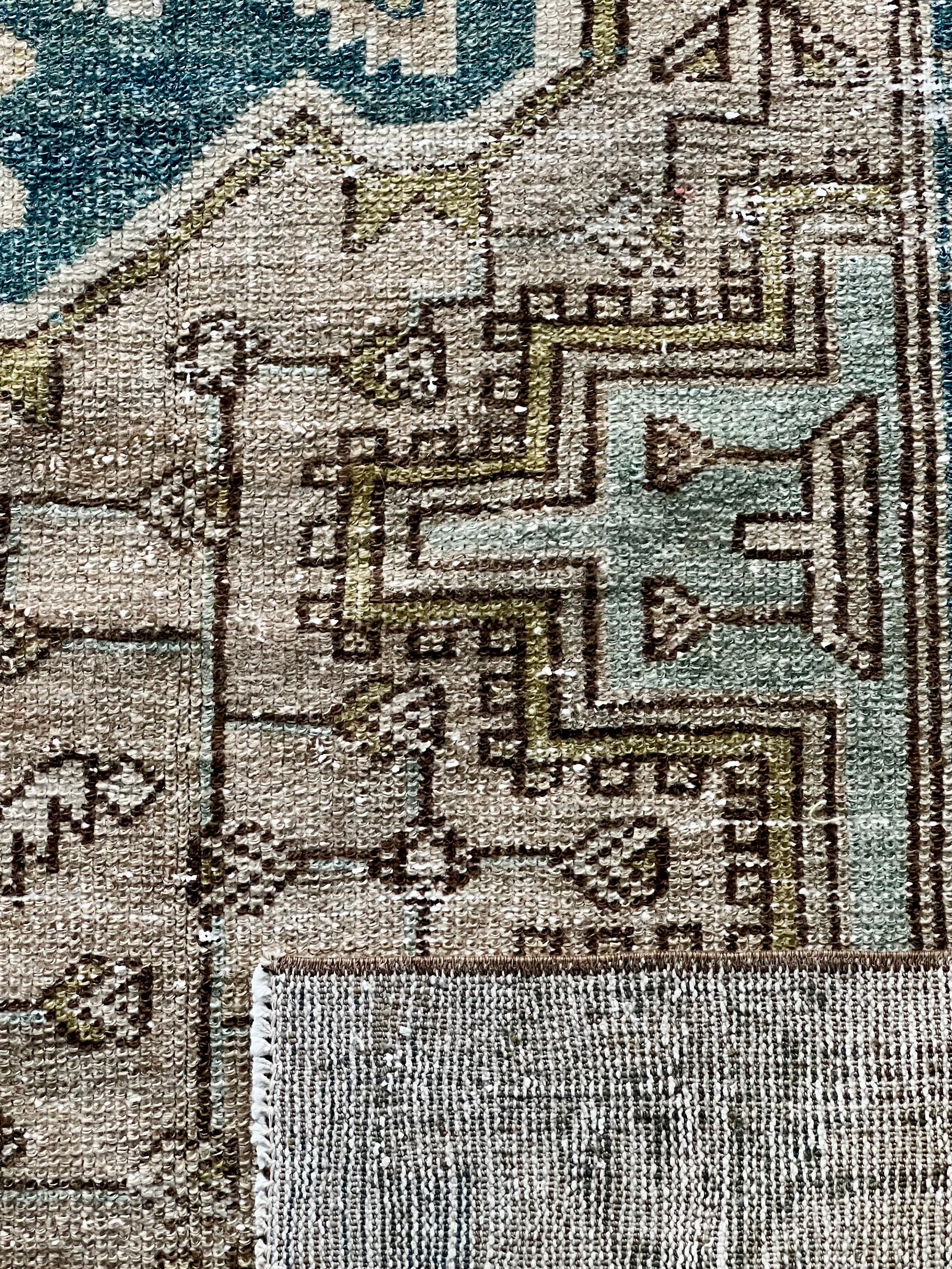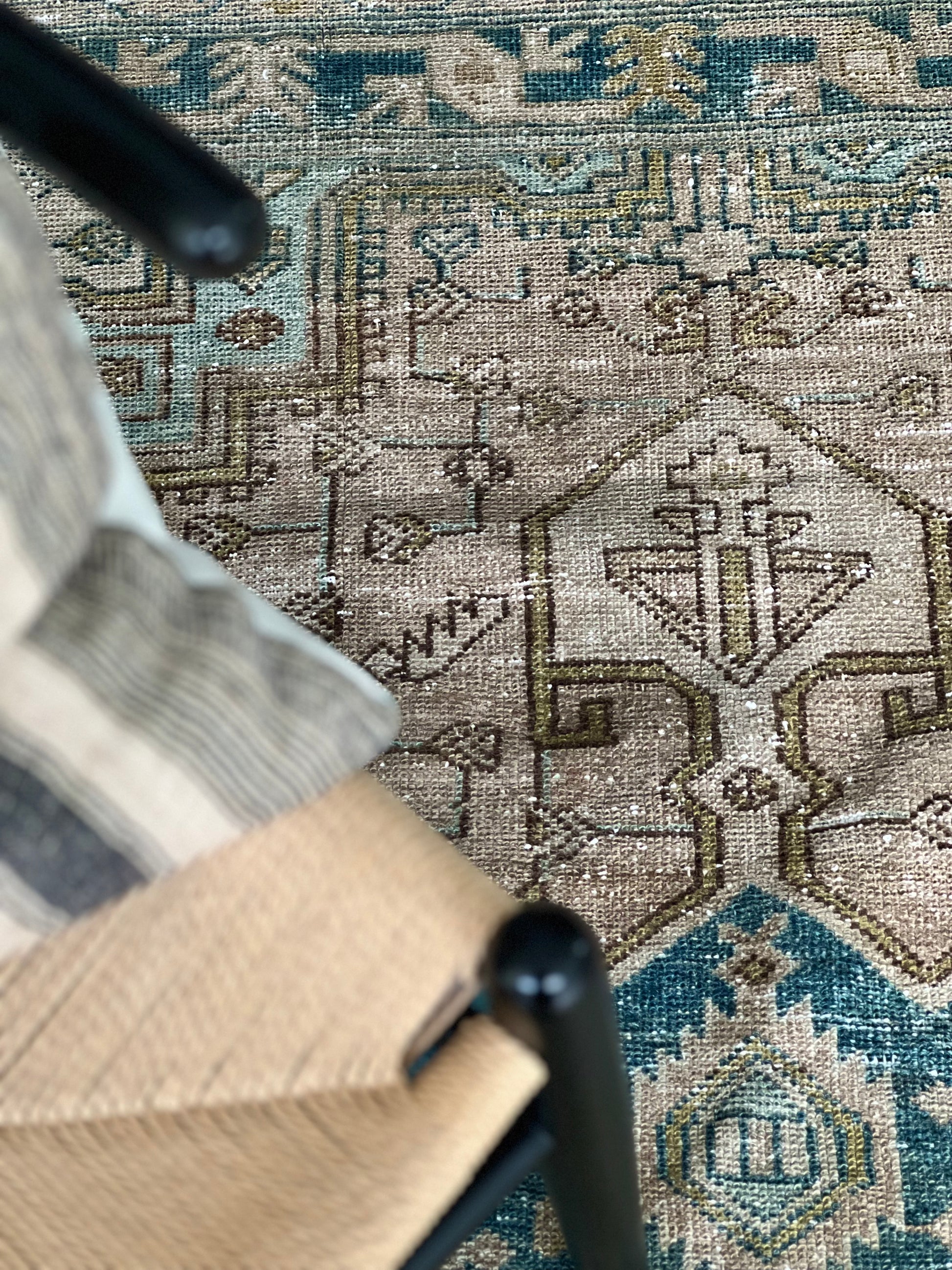 Woven by hand with vegetable dyes in the early 1900s, this rug is a true gem. The field celebrates highlights of cerulean, teal, sand, camel, and olive. The compilation of months of work and thousands of individually hand tied knots come together to create this incredible work of art.